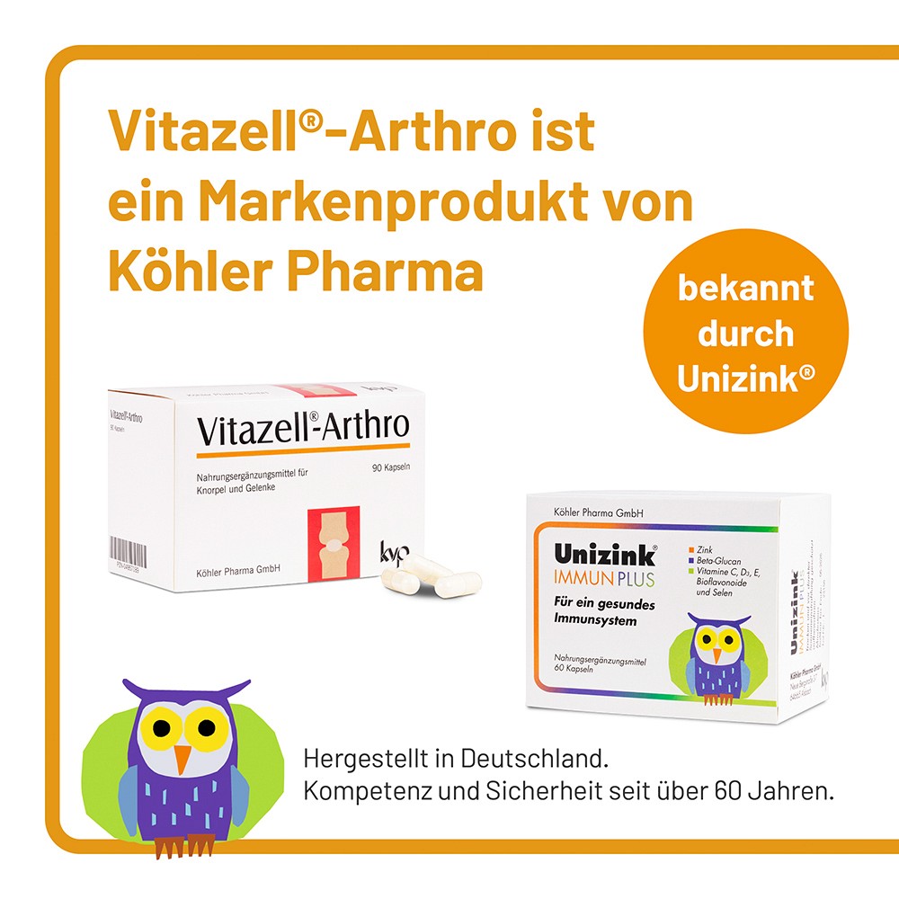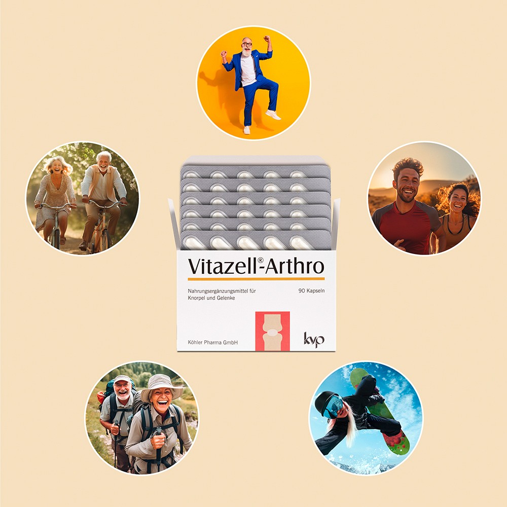 Das Nahrungsergänzungsmittel Vitazell®-Arthro enthält eine wertvolle Mikronährstoffkombination für Knorpel und Gelenke.
