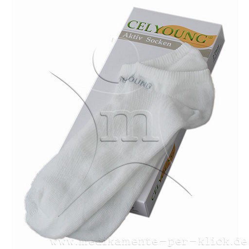 Die Celyoung Aktiv Socken sind atmungsaktiv und wirken antibakteriell. Gemeinsam mit der Celyoung Intensiv Fersen und Fusscreme bilden sie ein optimales Pflegesystem.Die vollsynthetischen und sehr atmungsaktiven Celyoung Aktiv Socken sind besonders als Unterstützung zur Pflege mit der Celyoung Intensiv Fersen und Fußcreme bei rissigen und extrem trockenen Füssen geeignet.
