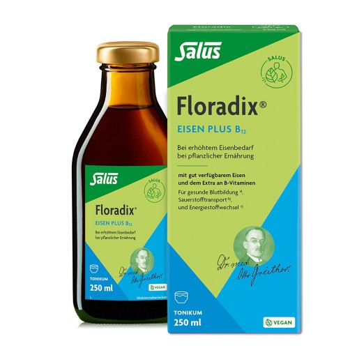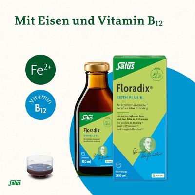 Floradix Eisen plus B12 von Salus wurde speziell für eine pflanzliche Ernährungsweise entwickelt.Je nach Belieben kann zwischen einem flüssigen Produkt und Kapseln gewählt werden. Beide Produkte, sowohl die Kapseln als auch das Tonikum, gewährleisten eine gut verträgliche Eisenversorgung mit gut verfügbarem zweiwertigem Eisen. Zusätzlich enthalten beide Produkte einen Vitamin B-Komplex mit Vitamin B12.