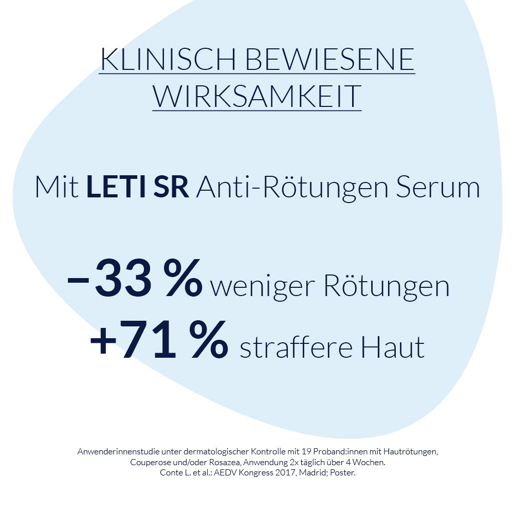 Klinische Studien belegen die Wirkung des LETI SR Anti-Rötungen Serums: Hautrötungen und Reizungen wurden verringert, die Hautbarriere gestärkt und der Wiederaufbau der Hautstruktur nach Gesichtslaserbehandlungen beschleunigt.1,2