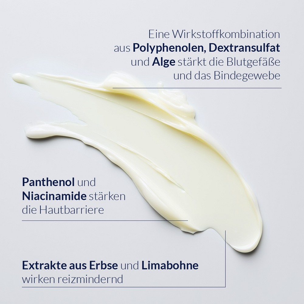 - Eine effektive Wirkstoffkombination aus Polyphenolen, Dextransulfat und Alge strafft die Haut, indem die Blutgefäße und das umliegende Bindegewebe gestärkt werden.