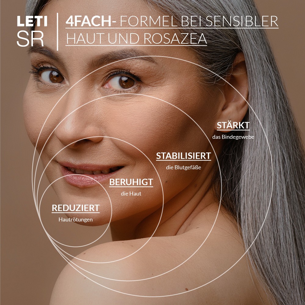 Faktoren wie genetische Veranlagung, Stress oder UV-Strahlung können feinste Blutgefäße (Mikrokapillargefäße) der Haut schwächen und weiten. Dadurch kommt es zu Rötungen im Gesicht, sichtbaren Äderchen oder zu Rosazea. Die aktiven Inhaltsstoffe in LETI SR bieten einen innovativen doppelten Schutz der Blutgefäße.Sie stabilisieren sie und stärken ihr stützendes Bindegewebe (Anti-Aging-Effekt).1 Das Ergebnis: weniger Rötungen2, mehr Straffung. LETI SR wurde speziell für empfindliche und gerötete Haut sowie Rosazea Subtyp I entwickelt.