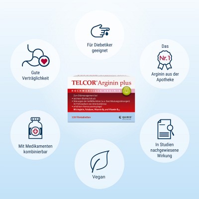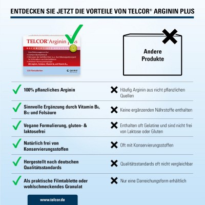- AUSGEZEICHNETE QUALITÄT: Die Kombination aus natürlichem L-Arginin und B-Vitaminen in Telcor® Arginin plus ist sehr gut verträglich und mit Medikamenten kombinierbar. Das Produkt ist glutenfrei, laktosefrei, zuckerfrei (Filmtabletten) und frei von tierischen Fetten sowie Konservierungsstoffen.