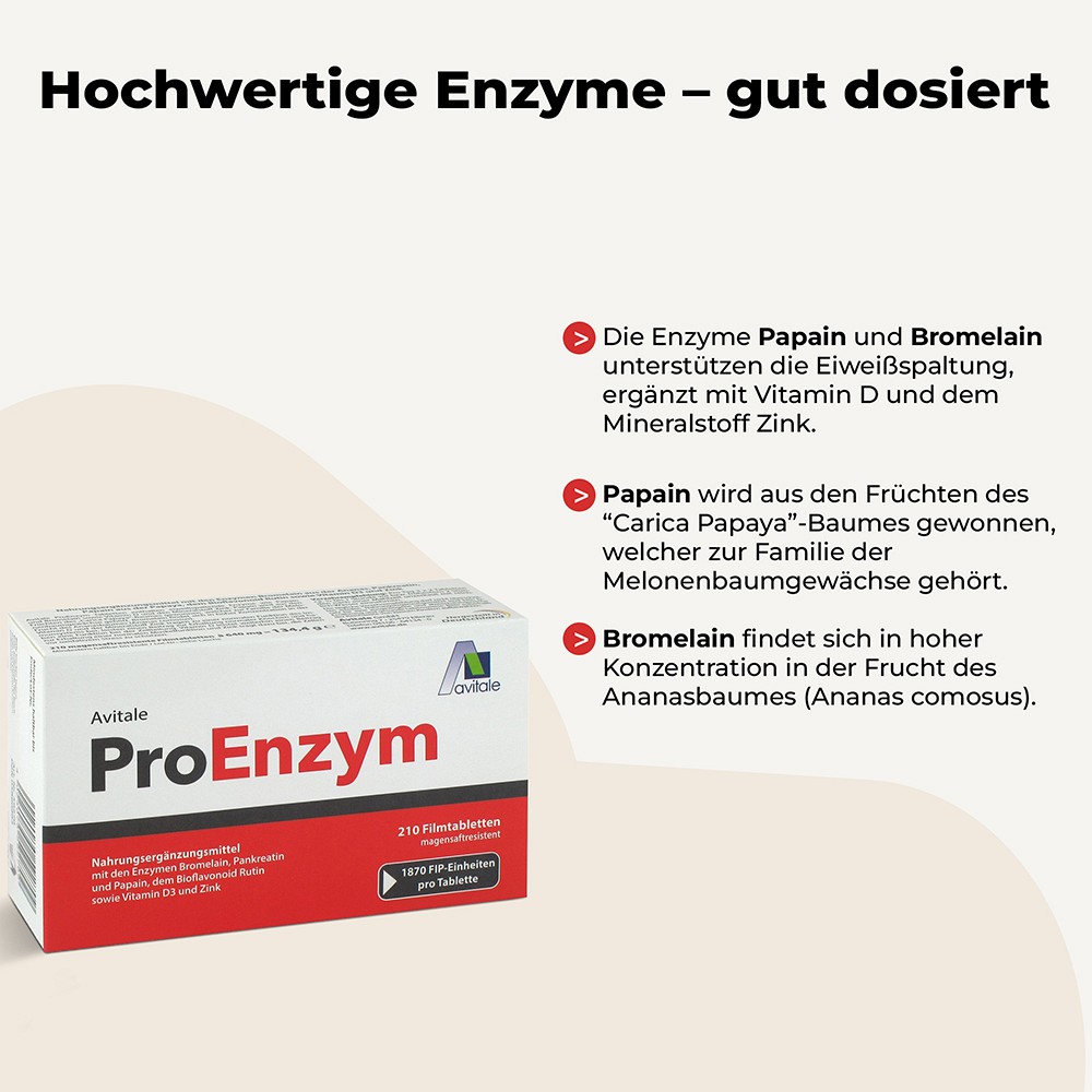 Avitale ProEnzym Tabletten enthalten eiweißspaltende Enzyme wie Papain und Bromelain sowie Vitamin D und den Mineralstoff Zink. Papain wird aus den Früchten des „Carica Papaya“-Baumes gewonnen, welcher zur Familie der Melonenbaumgewächse gehört. Bromelain findet sich in hoher Konzentration in der Frucht des Ananasbaumes (Ananas comosus).