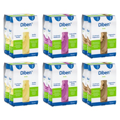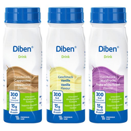 Diben® Drinks sind eine trinkfertige Flüssignahrung mit einem niedrigen glykämischen Index, die insbesondere für Menschen mit einer gestörten Glukosetoleranz geeignet ist, um den täglichen Energie- und Eiweißbedarf zu decken.Die Trinknahrung ist reich an einfach ungesättigten Fettsäuren (MUFA) und zugleich natrium- und cholesterinarm. Die enthaltenen Ballaststoffe unterstützen eine gesunde Verdauung. Zudem ist der gut verträgliche Drink laktosearm und glutenfrei. Diben® Drinks sind in den drei leckeren Geschmacksrichtungen Vanille, Cappuccino und Waldfrucht erhältlich.