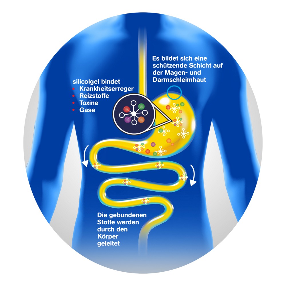 silicolgel wirkt als „Magnet“, der Schadstoffe und Reizstoffe sowie schädliche Toxine und Pathogene bindet und sie so unschädlich macht.