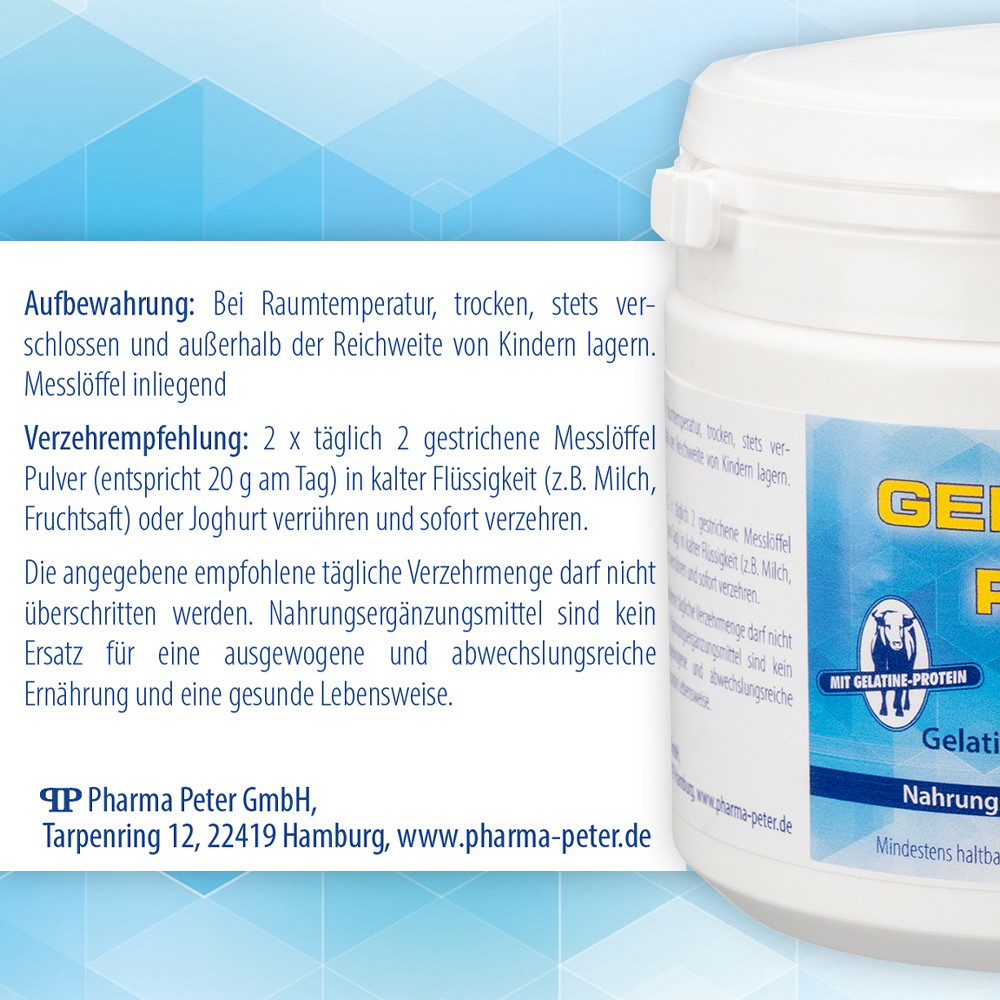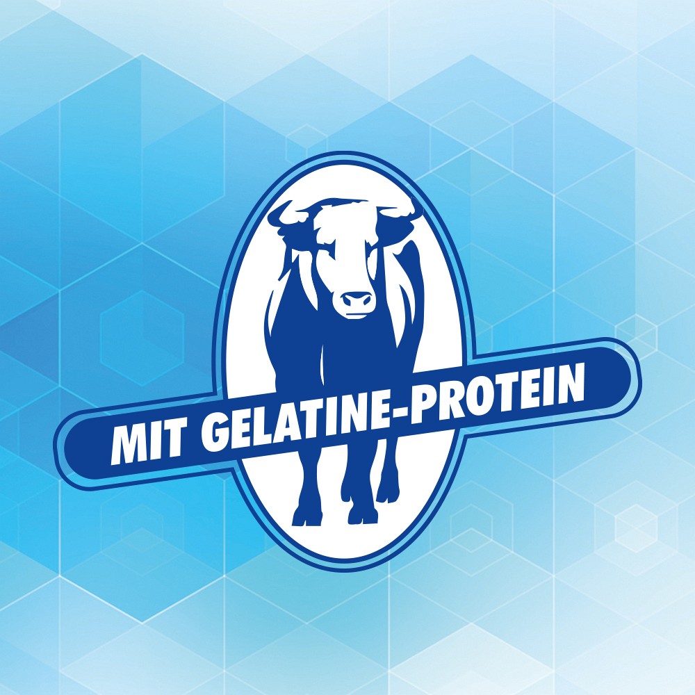2 x täglich 2 gestrichene Messlöffel (=10 g) Gelatine-Pulver in kalter Flüssigkeit (z.B. Milch, Fruchtsaft) oder Joghurt verrühren und sofort verzehren. Messlöffel inliegend!
