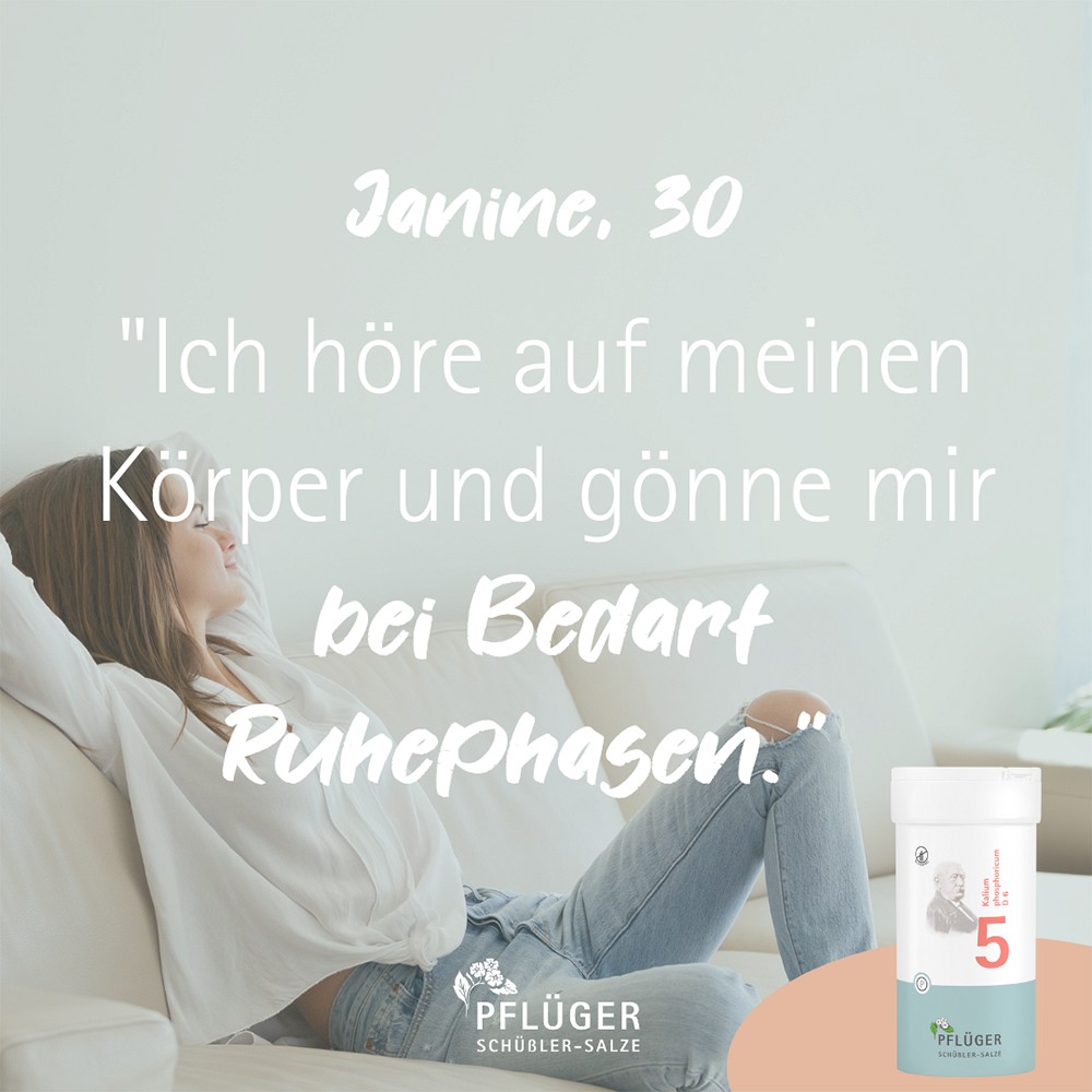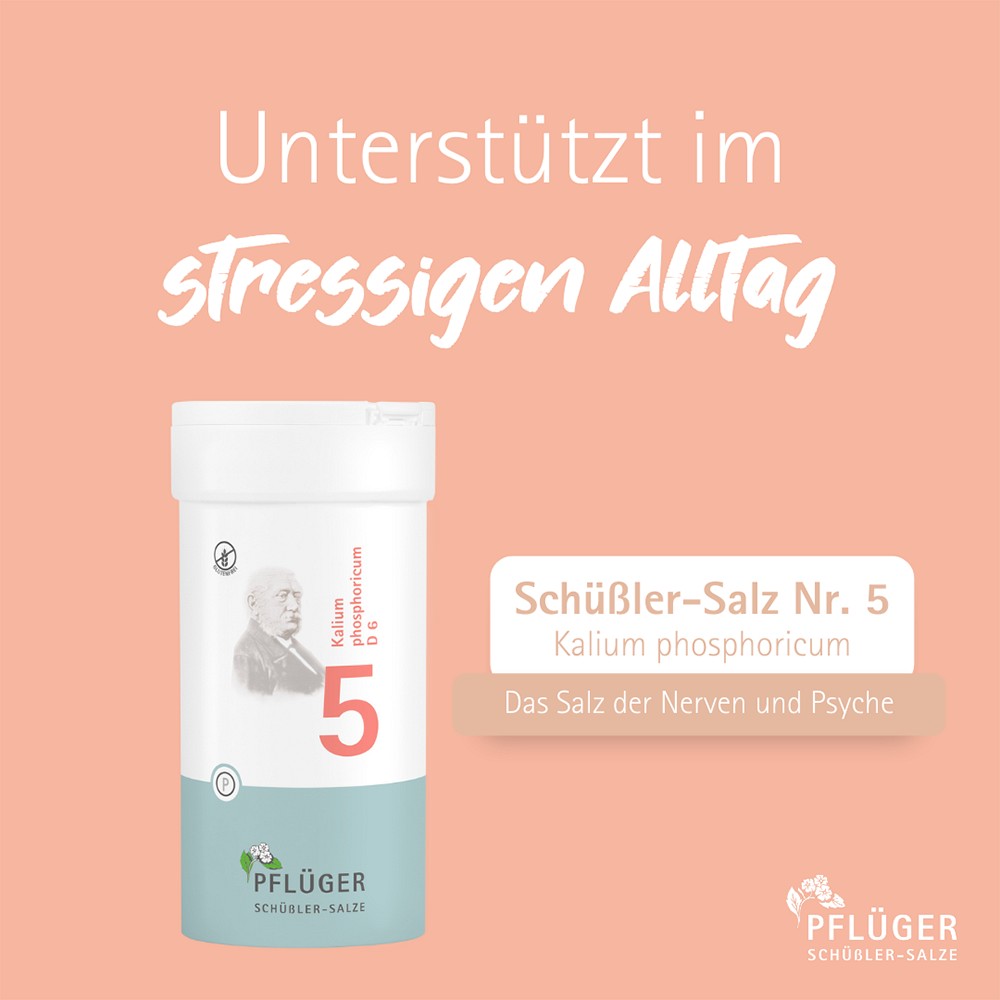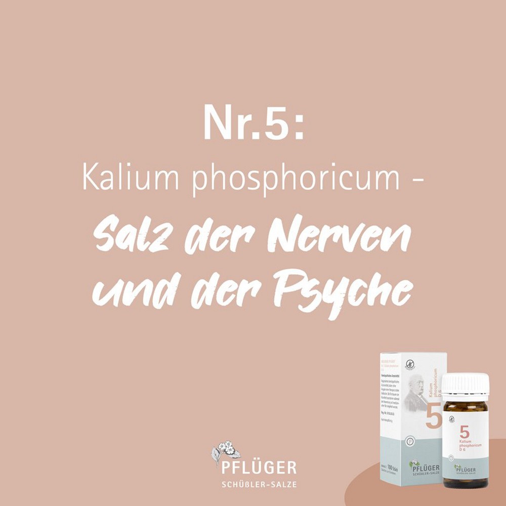 **Es gibt Situationen im Leben, die einen besonders fordern oder alles von uns abverlangen. Dann ist es wichtig, einen kühlen Kopf und starke Nerven zu haben und mit den richtigen Maßnahmen den Körper vor Überlastungen und Stress zu schützen.**Das Schüßler-Salz Nr. 5 Kalium phosphoricum von Pflüger ist das Salz der Nerven und Psyche und unterstützt Sie dabei, sich ausgeglichen zu fühlen und mit Freude das Leben zu genießen. Kalium phosphoricum kommt im Körper in Gehirn-, Nerven-, Muskel- und Blutzellen sowie in der Milz vor.