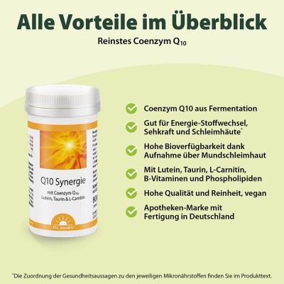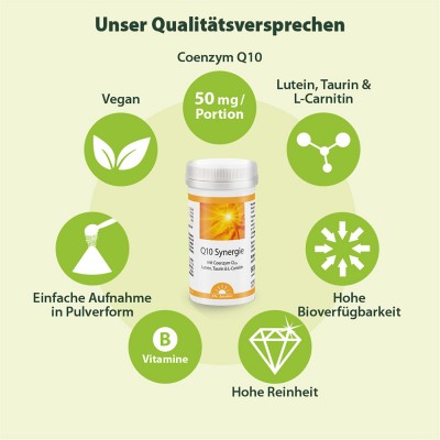 *Die in Q10 Synergie enthaltenen Nährstoffe leisten einen Beitrag zu den folgenden normalen Körperfunktionen:- Energiestoffwechsel und Reduktion von Müdigkeit - Vitamine B2, B12 und Niacin