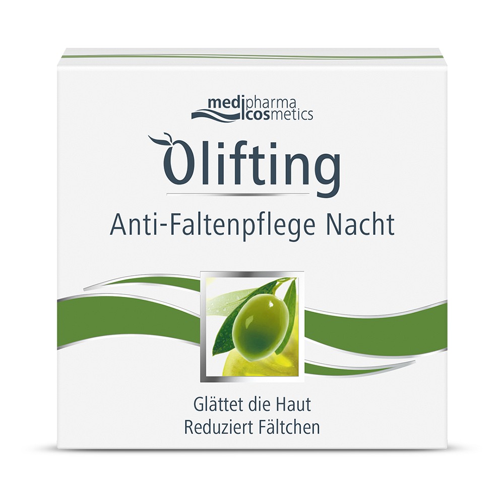 Reduziert die Faltentiefe und strafft über NachtDie Olifting Anti-Faltenpflege Nacht mit kaltgepresstem Olivenöl aus der Toskana und hautstraffenden Pflegestoffen reduziert die Faltentiefe und sorgt fü.r ein glatteres und strafferes Hautbild. Angereichert mit Cupuaçu-Butter, Alpha-Bisabolol und dem Hautpflegevitamin B5 wird die Haut während der nächtlichen Regenerationsphase aufgebaut. Sie fü.hlt sich am nächsten Morgen zart und gepflegt an.
