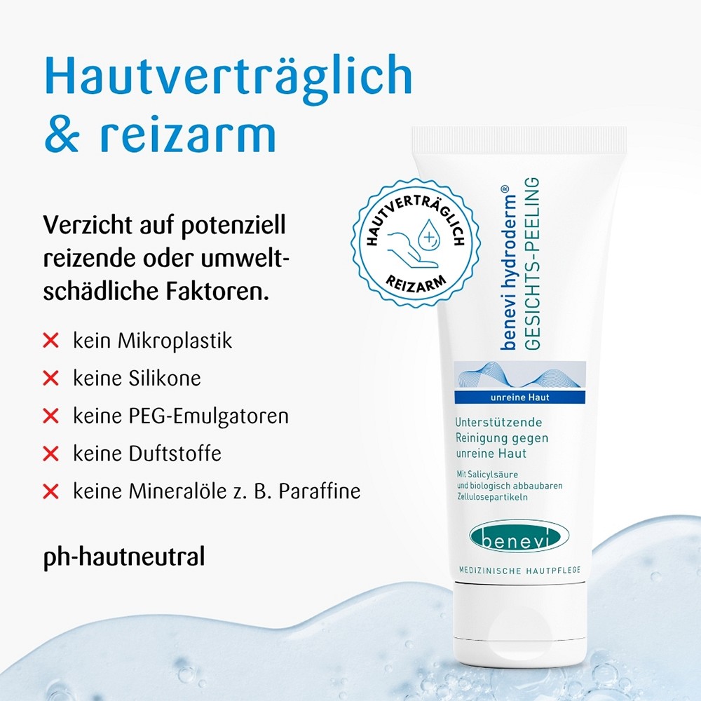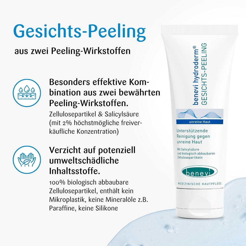 benevi hydroderm Gesichtspeeling ist ein dermatologisch getestetes Peeling für fettige, zu Unreinheiten neigende Haut. Die Kombination aus 2 % Salicylsäure und plastikfreien Zellulosepartikeln entfernt überschüssigen Talg und abgestorbene Hautschüppchen gründlich.
