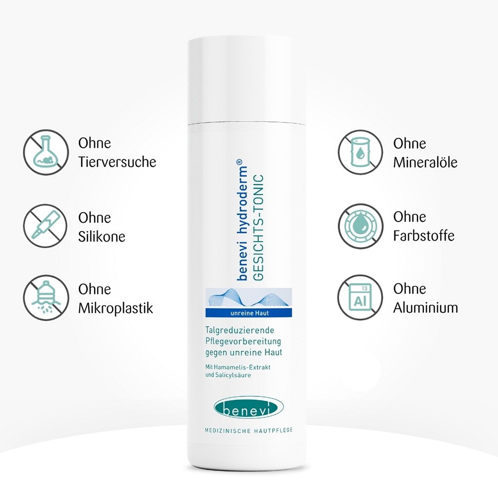 benevi hydroderm Gesichts-Tonic - Das klärende Gesichtstonic wurde speziell für fettige, unreine und glänzende Gesichtshaut entwickelt. Es entfernt überschüssigen Talg, reduziert sichtbar den Fettglanz und unterstützt ein feineres Hautbild.