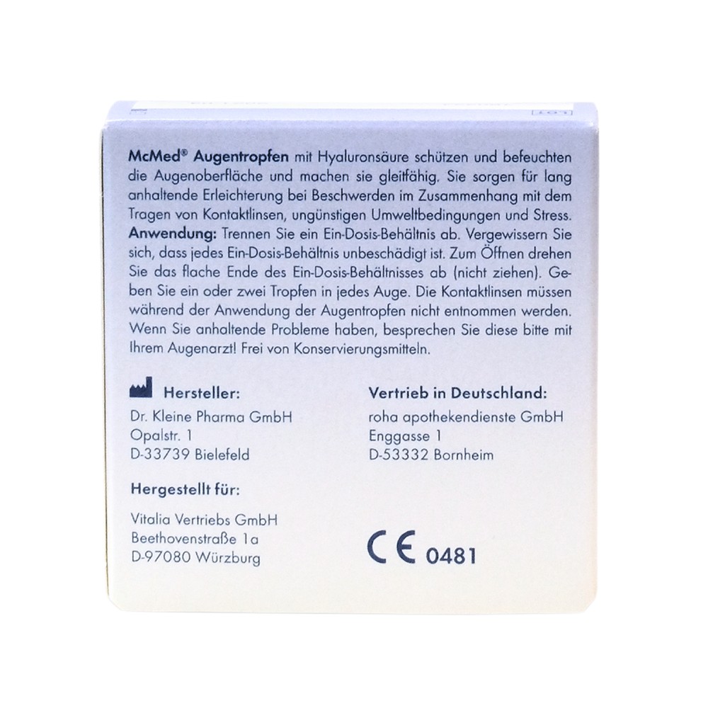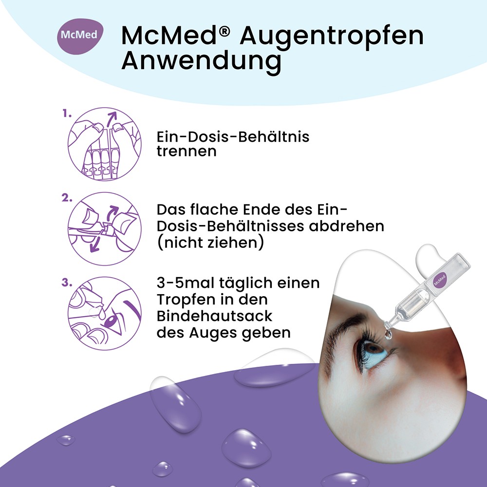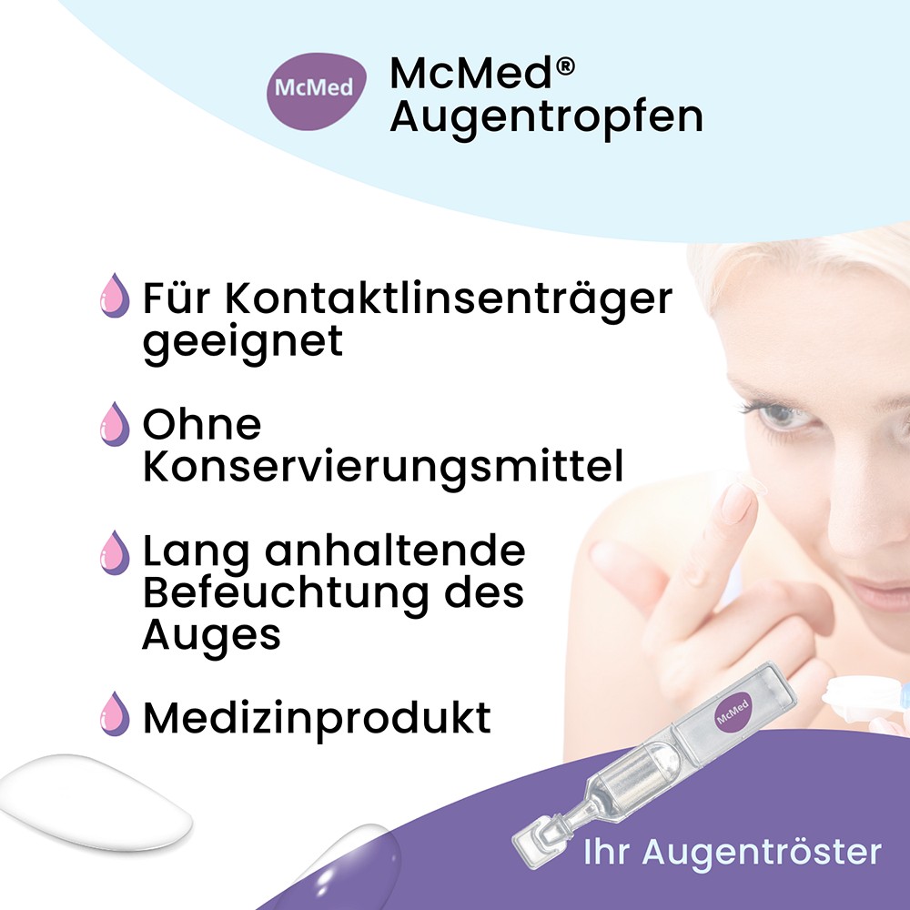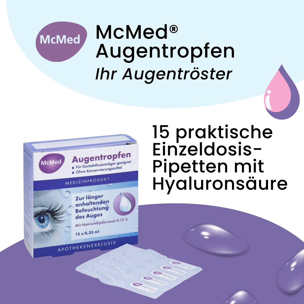 Weiche oder harte Kontaktlinsen, Klimaanlagen, Wind und Trockenheit, aber auch Zigarettenrauch oder das tägliche Arbeiten am Computerbildschirm und lange Autofahrten strengen das Auge an. Irritationen und trockene Augen können die Folge sein. McMed Augentropfen sind die ideale Lösung für trockene, gereizte und müde Augen.Dank ihrer speziellen Formulierung mit 0,15 % Natriumhyaluronat bilden sie einen langanhaltenden, stabilen Schutzfilm auf der Hornhaut, ohne die Sehleistung zu beeinträchtigen. Die Augentropfen bestehen ausschließlich aus natürlichen, biologischen Substanzen, sind konservierungsmittelfrei und daher besonders gut verträglich – auch bei längerer Anwendung.