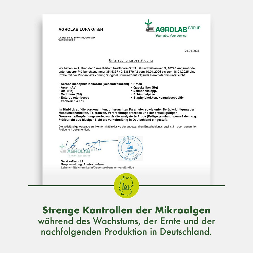 Dies lassen wir regelmäßig von einem unabhängigen Labor bestätigen. Da Original Spirulina im Süßwasser wächst, ist es nicht nur frei von schädlichen Schwermetallen (Quecksilber, Arsen, Blei!) und Mikroplastik, sondern kann es wegen des geringen Jodgehaltes auch von Patienten mit Schilddrüsenentzündungen (z.B. Hashimoto) bedenkenlos eingenommen werden.