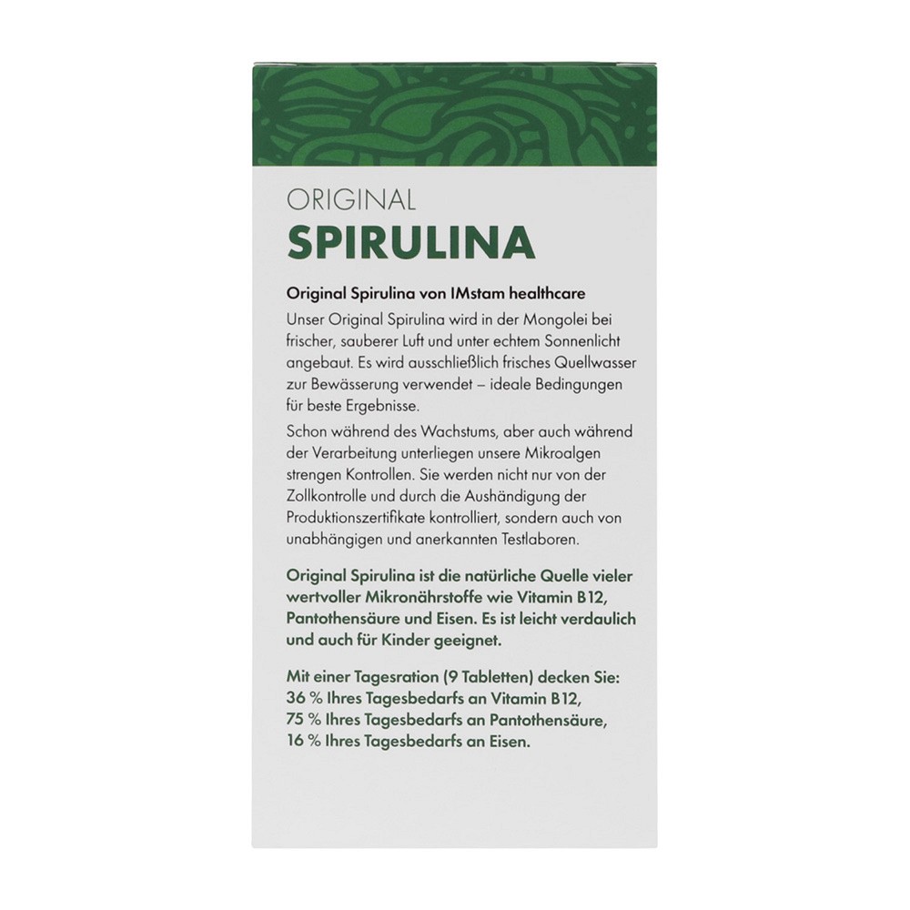 Original Spirulina ist die natürliche Quelle von über 100 wertvollen Nährstoffen und Antioxidantien. So decken Sie mit einer Einnahme von 9 Tabs am Tag z.B. bereits 36% Ihres Bedarfes an Vitamin B12, 75% an Pantothensäure (Vitamin B5) und 16% an Eisen. Mit einem Proteinanteil von über 50% zählt die Original Spirulina Alge weltweit zu den eiweißreichsten Lebensmitteln.