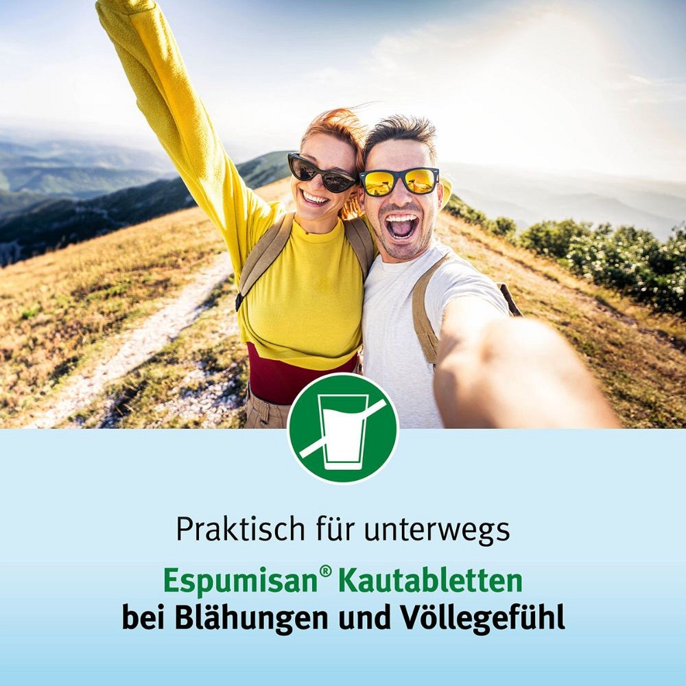 1 Espumisan Kautablette enthält 42,33 mg Simeticon.Die sonstigen Bestandteile sind: Lactose-Monohydrat, Hochdisperses Siliciumdioxid, Copovidon, Sorbitol (E 420) [Ph. Eur.], Mannitol (E 421) [Ph. Eur.], Pfefferminz-Aroma, Talkum.