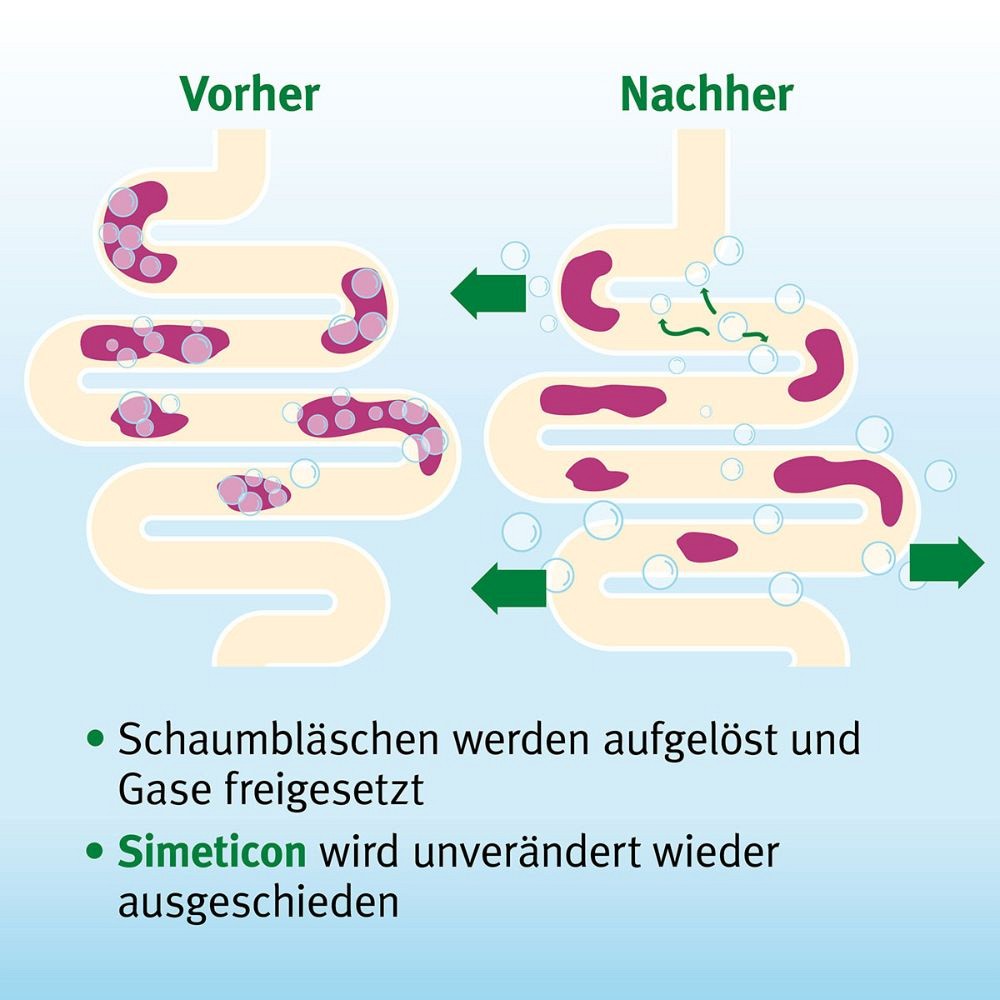 Anwendungsgebiete: Zur symptomatischen Behandlung gasbedingter Magen-Darm-Beschwerden, wie z. B. Blähungen (Meteorismus), Völlegefühl. Zur Vorbereitung von Untersuchungen im Bauchbereich, wie z. B. Röntgen und Sonographie (Ultraschall).