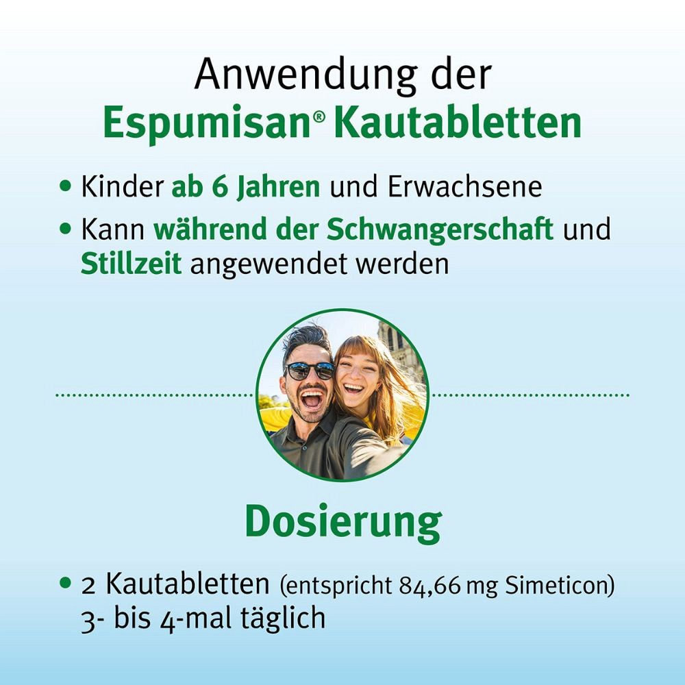 Nehmen Sie die Kautabletten gut zerkaut zu oder nach den Mahlzeiten ein – bei Bedarf auch vor dem Schlafengehen. Die Dauer der Anwendung richtet sich nach dem Verlauf der Beschwerden. Sie können Espumisan Kautabletten (falls erforderlich) auch über einen längeren Zeitraum einnehmen.