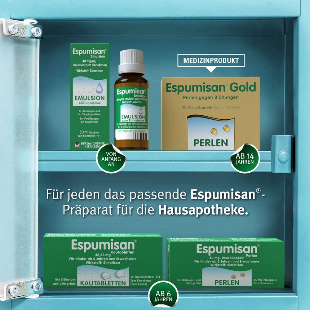 Was tun bei Blähungen und Völlegefühl? Espumisan Kautabletten sind ein Magen-Darm-Mittel, das als Entschäumer wirkt und als ein Hilfsmittel in der Diagnostik eingesetzt werden kann.Werfen Sie einen Blick auf die weiteren Vorteile: