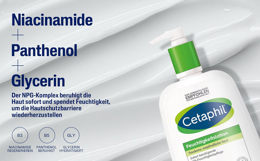 Zusätzlich zur Unterstützung natürlicher Feuchtigkeit auf der Haut wirken Glycerin und ProVitamin B5 (Dexpanthenol) in der Cetaphil Feuchtigkeitslotion hydratisierend und unterstützen den Hautstoffwechsel.
