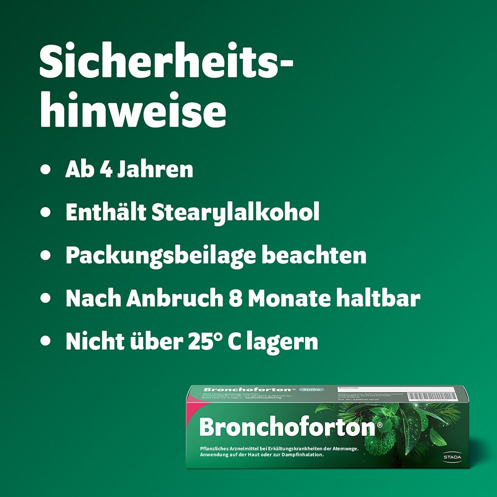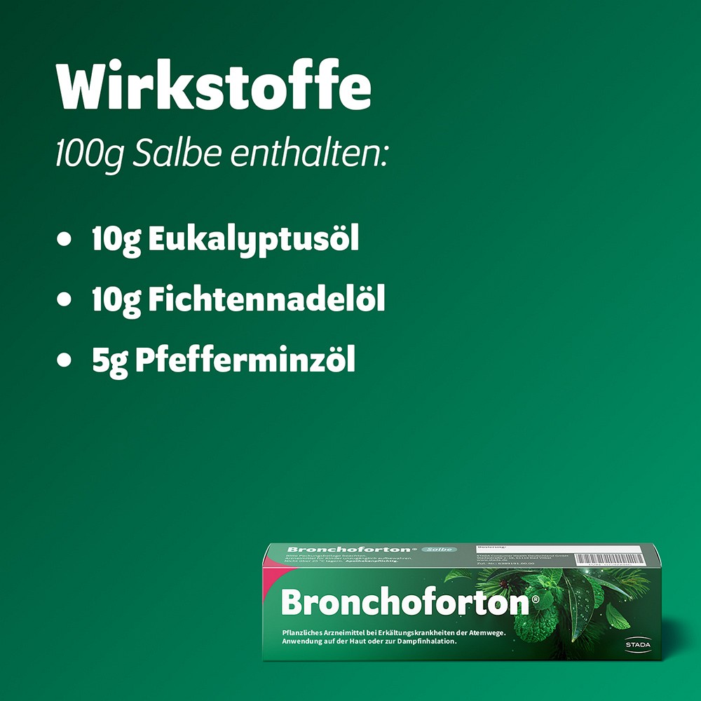 Nach Bedarf 2- bis 4-mal täglich Inhalieren oder Einreiben. Zum Inhalieren Bronchoforton® Salbe mit Wasser übergießen und die aufsteigenden Dämpfe etwa 10 Minuten einatmen.Zum Einreiben Bronchoforton® Salbe auf Brust oder Rücken einmassieren.