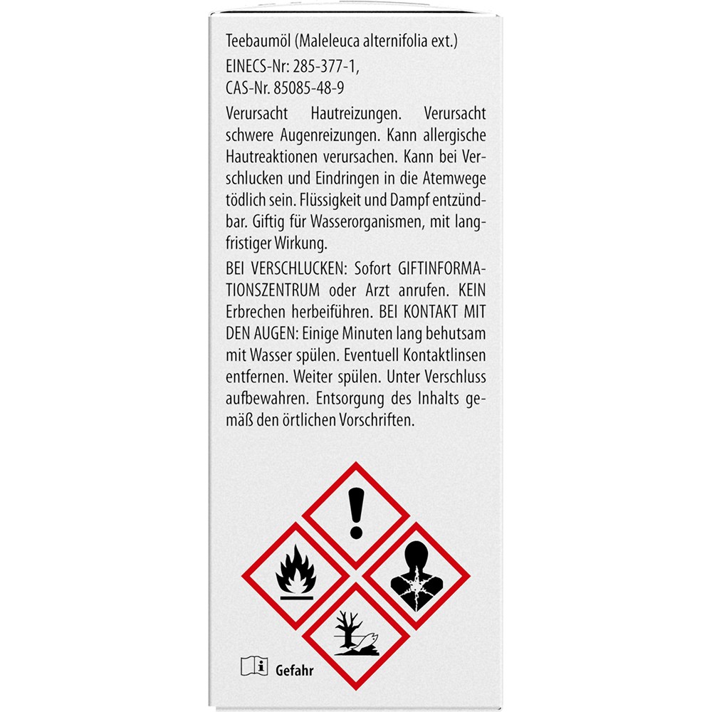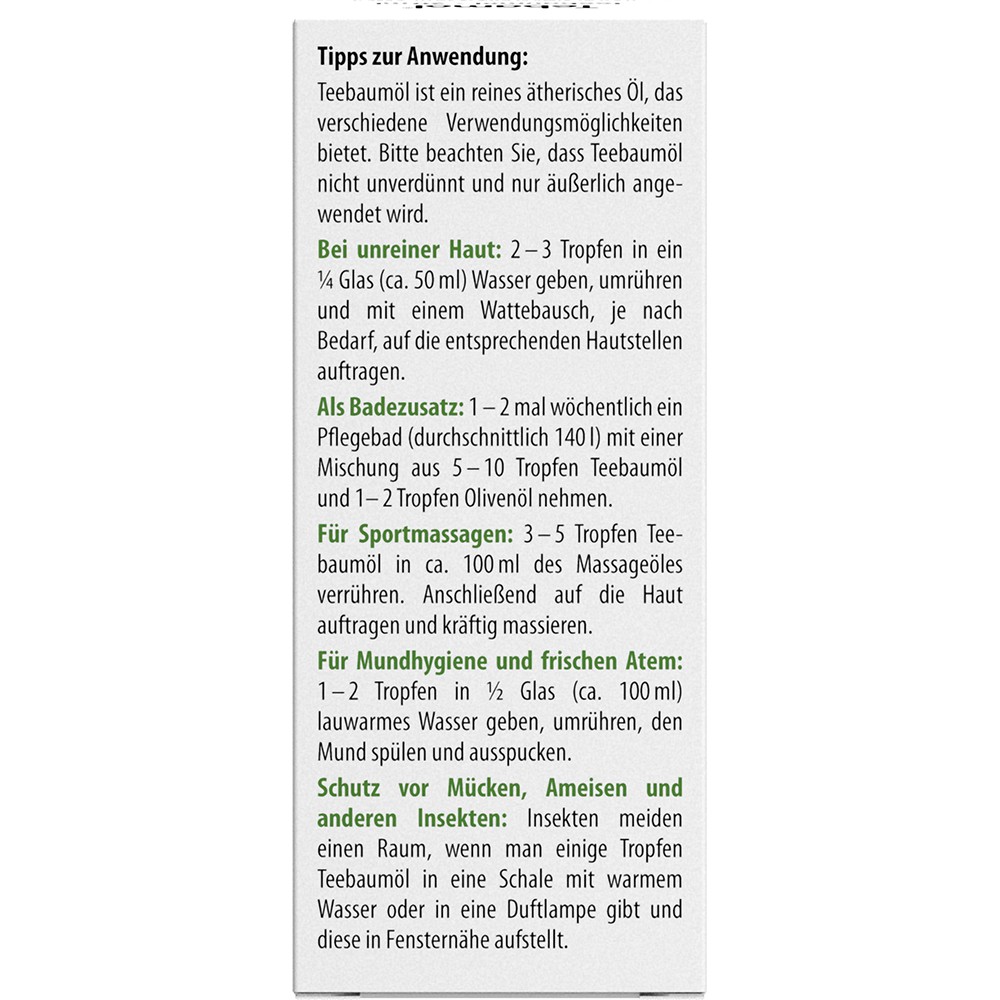 Teebaumöl ist ein reines ätherisches Öl, das verschiedene Verwendungsmöglichkeiten bietet. Bitte beachten Sie, dass Teebaumöl nicht unverdünnt und nur äußerlich angewendet wird.