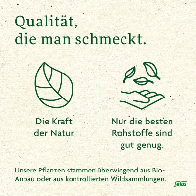 Den Filterbeutel in einer Tasse mit 200 ml sprudelnd kochendem Wasser übergießen und ca. 5 bis 8 Minuten ziehen lassen. Anschließend den Filterbeutel entfernen. Empfehlung: 2 bis 3 Tassen/Tag