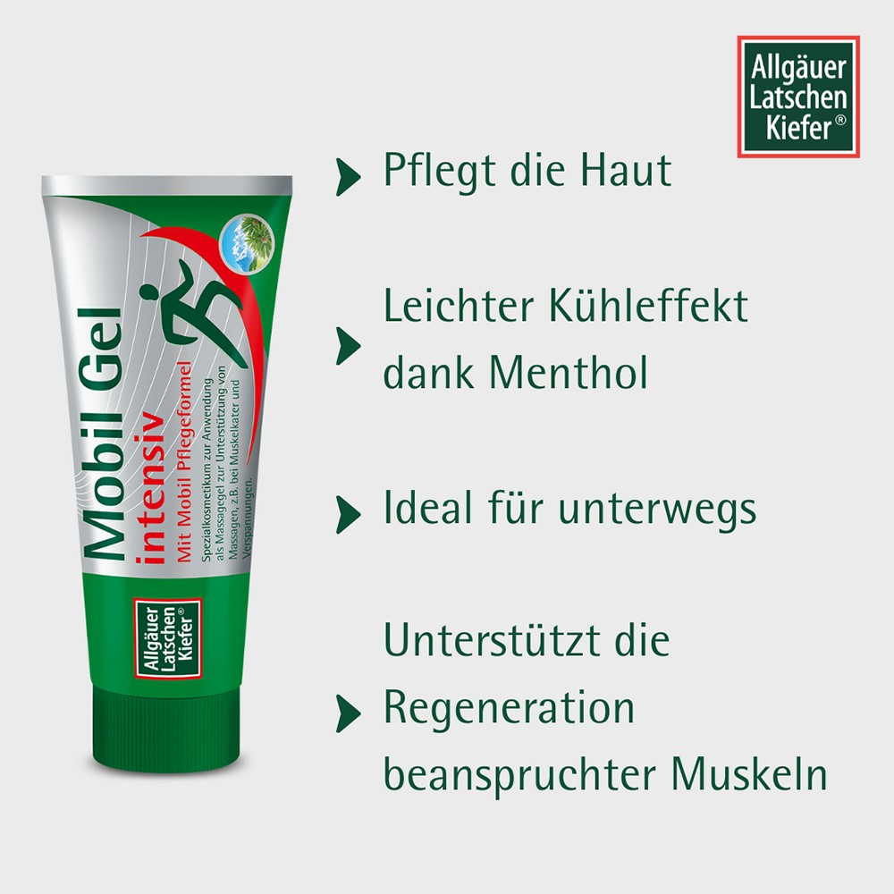 Das Mobil Gel intensiv von Allgäuer LAtschenkiefer ist ein Spezialkosmetikum zur Anwendung als Massagegel für Gelenke und Muskeln z.B. bei Muskelkater und Verspannungen.Durch die Massage wird die Regeneration und Entspannung der beanspruchten Muskeln unterstützt und gleichzeitig durch die Mobil-Pflegeformel die Haut gepflegt.