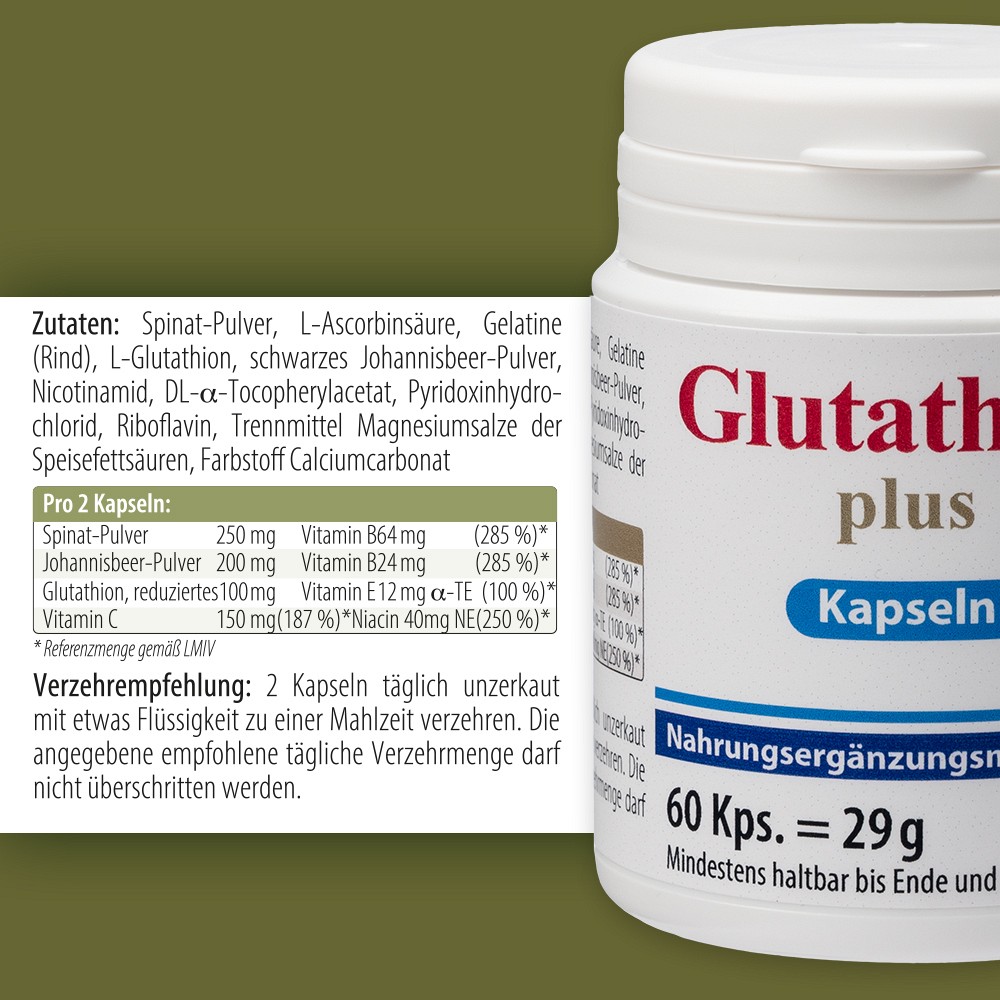 Nahrungsergänzungsmittel mit Spinat-Pulver, den Vitaminen B6, B2, E, C, Niacin und reduziertem Glutathion.