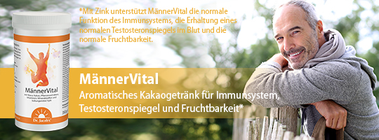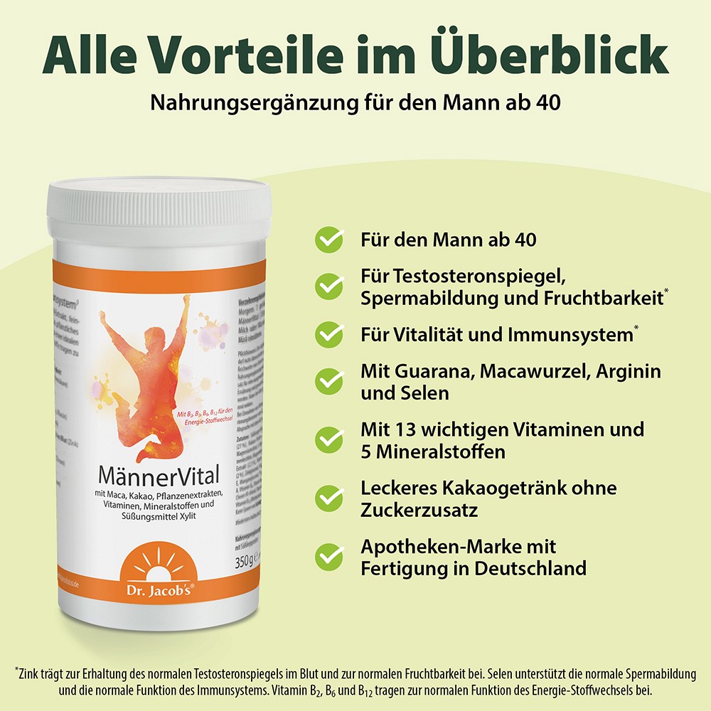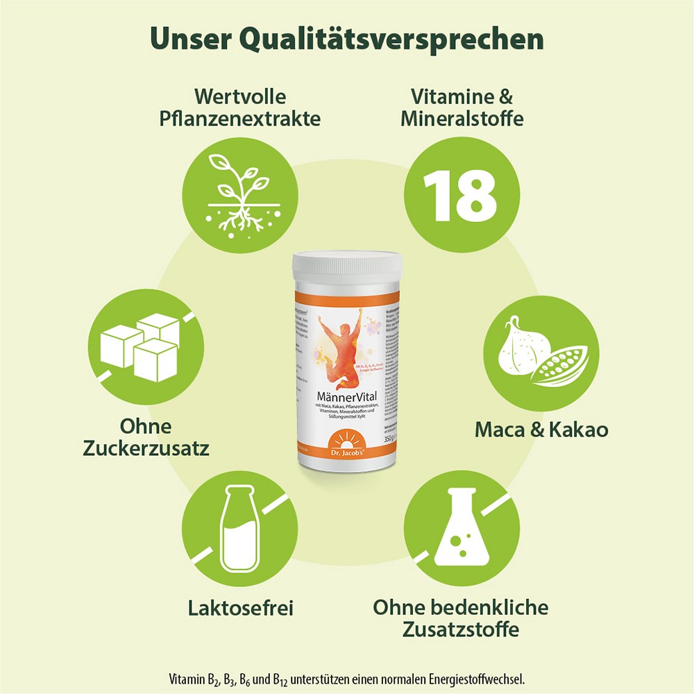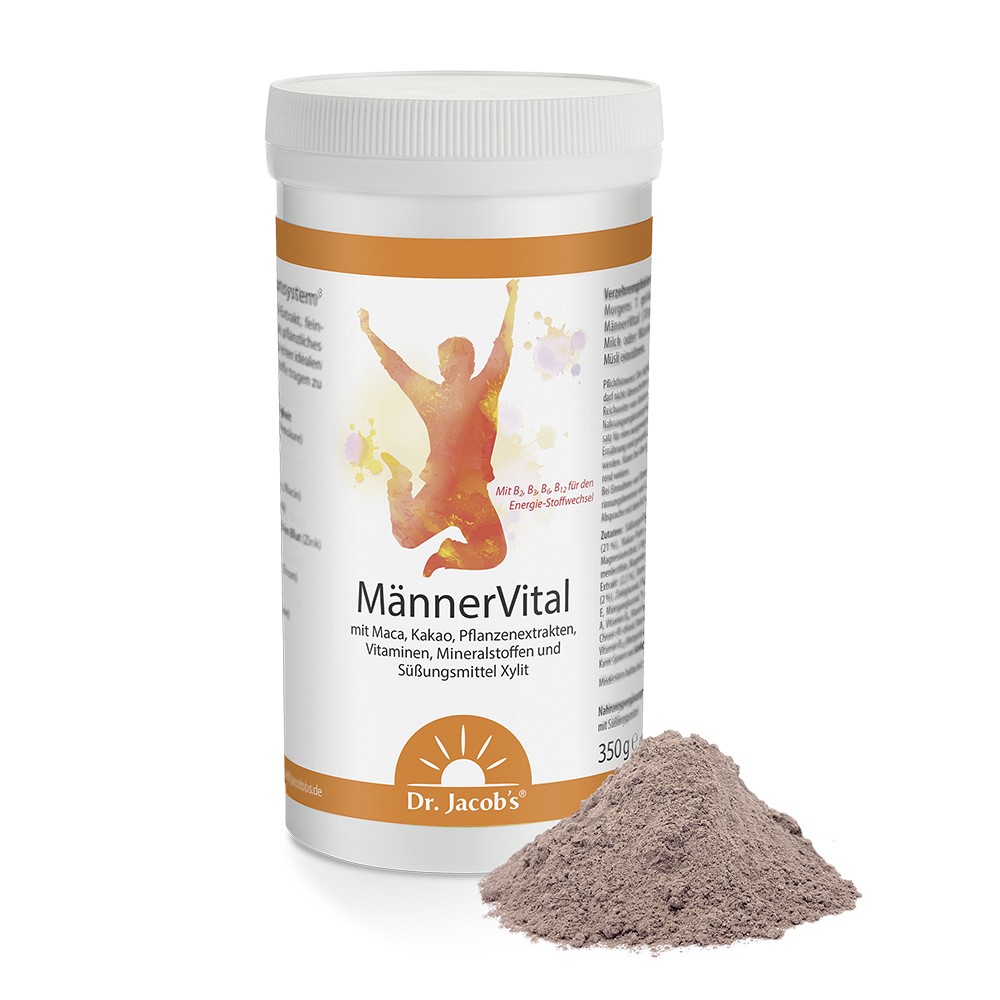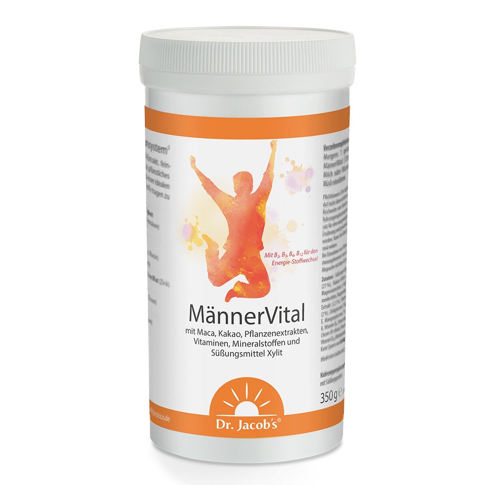 Dr. Jacob’s MännerVital* ist speziell auf die Bedürfnisse von Männern zugeschnitten. Es liefert extra viel Maca Pulver, Granatapfel-Extrakt, anregendes Guarana, pflanzliches Arginin und Selen sowie feinherben Kakao.
