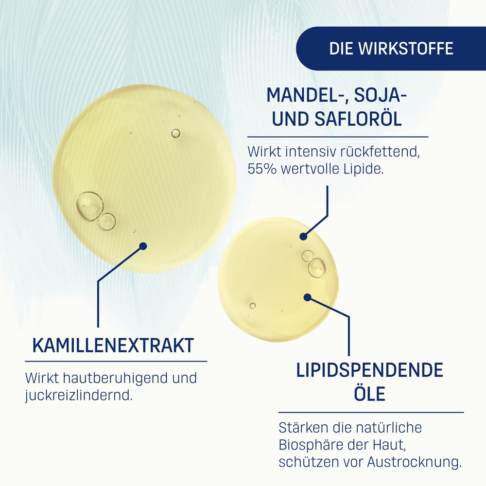 - Mit pflegenden, rückfettenden Komponenten wie Mandel-, Soja-, Safloröl und Kamillenextrakt, wirken hautberuhigend und juckreizlindernd