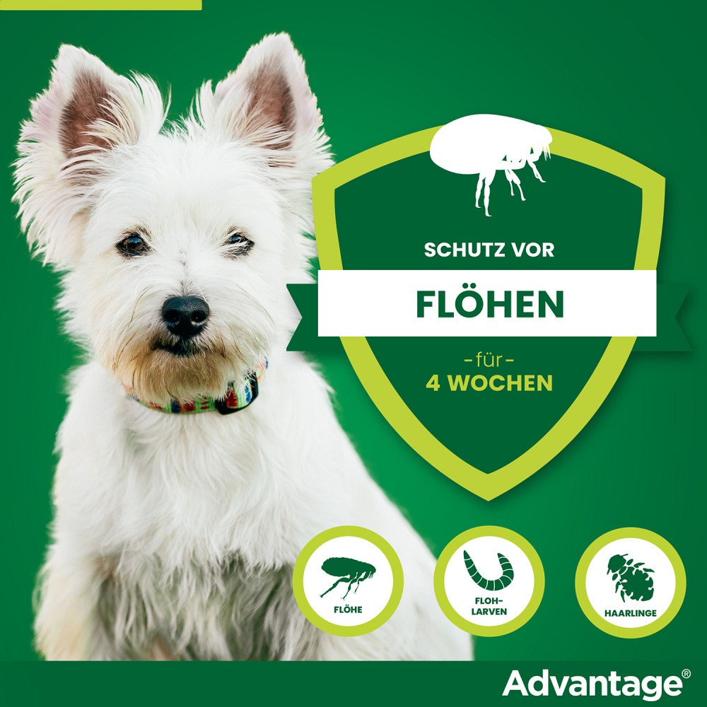 Ihr Hund ist für bis zu 4 Wochen gegen Flöhe und Flohlarven in der unmittelbaren Umgebung geschützt. Haarlinge werden sofort abgetötet. Bei sehr großen Hunden empfiehlt sich zur optimalen Verteilung des Wirkstoffes den Inhalt einer Pipette Advantage® Spot-On auf drei bis vier hautstellen entlang der Rückenlinie zu verteilen.