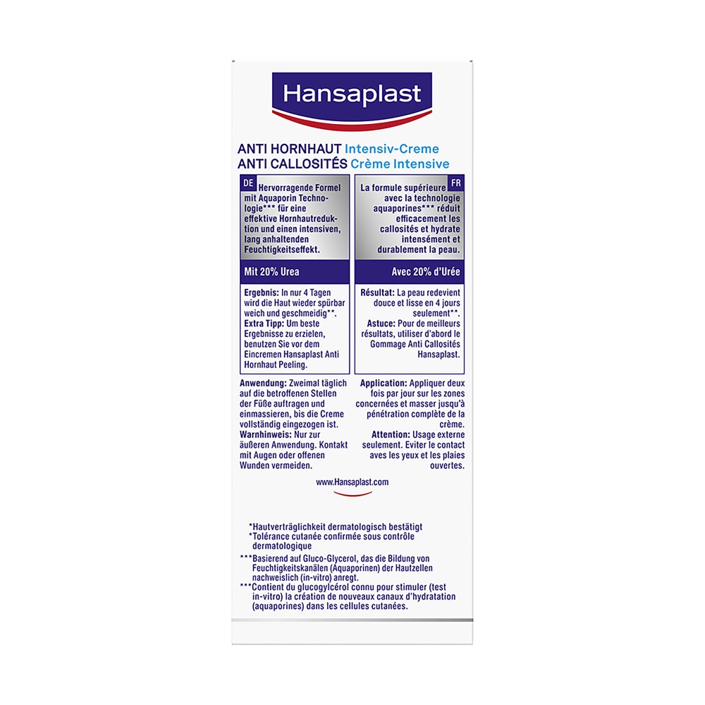 Die Hansaplast Anti Hornhaut Intensiv-Creme ist ein effektives Mittel zur Hornhaut Entfernung und spendet dabei gleichzeitig sehr trockener Haut an den Füßen nachhaltig Feuchtigkeit. Mit 20 % des Wirkstoffs Urea, verbessert sie den Feuchtigkeitshaushalt der Haut, indem sie ihr hilft, mehr Feuchtigkeit zu binden und die natürliche Hautschutzfunktion stärkt. Schon nach den ersten 4 Tagen zeigt die Anwendung der Fußpflege erste Ergebnisse.* Die Hansaplast Hornhaut Creme kann auch bei Diabetes verwendet werden.Für besonders weiche Füße: Zuvor das Hansaplast Anti Hornhaut 2in1 Peeling verwenden.**