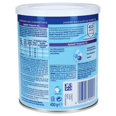 Aptamil Pregomin AS - Unsere Spezialnahrung bei KuhmilchproteinallergieAptamil Pregomin AS non-allergene Spezialnahrung bei Kuhmilchproteinallergie, 400g als Pulver - enthält 100% freie, non-allergene Aminosäuren, ist frei von Kuhmilchprotein und lactosefrei. So ist es speziell auf die Ernährungsbedürfnisse von Babys mit Kuhmilchproteinallergie abgestimmt.