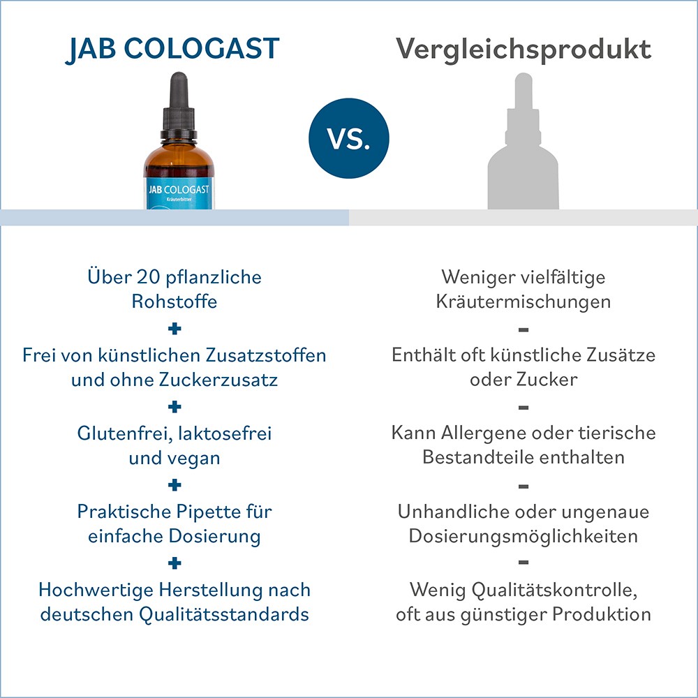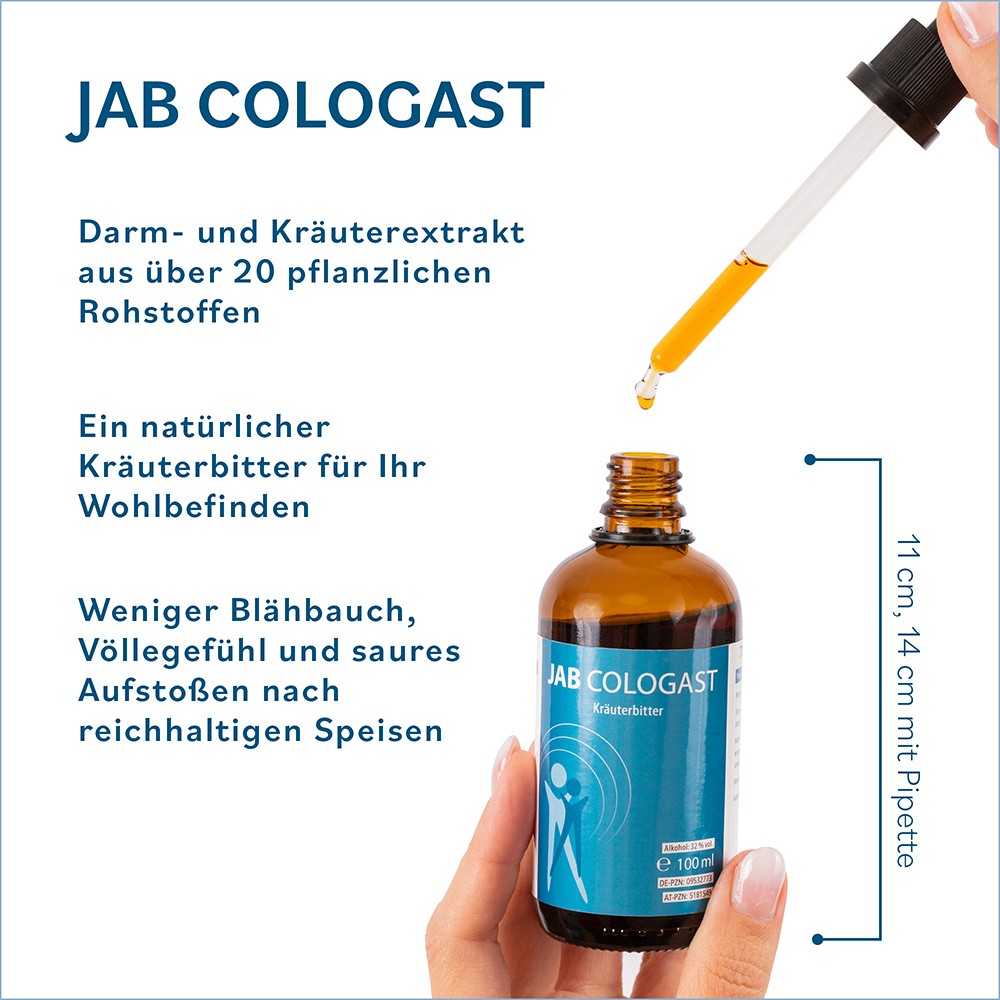Bitte stets verdünnt ca. 10 Minuten vor einer Mahlzeit einnehmen. Da es sich bei JAB Cologast um einen Kräuterbitter handelt, sind keine Dosierungs- oder Indikationsangaben möglich.Darreichungsform