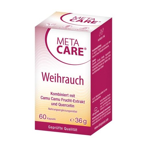 META CARE® Weihrauch kombiniert einen hochwertigen Extrakt der Boswelliasäure aus dem indischen Weihrauch (Boswellia serrata) mit pflanzlichem Vitamin C aus der Hagebutte. Das enthaltene Vitamin C unterstützt die Kollagenbildung im Körper. Kollagen baut Bindegewebe auf und kann dadurch eine intakte Knorpelfunktion unterstützen. Überdies unterstützt es das Immunsystem in seiner Funktion, unter anderem auch während und nach intensiver körperlicher Betätigung.