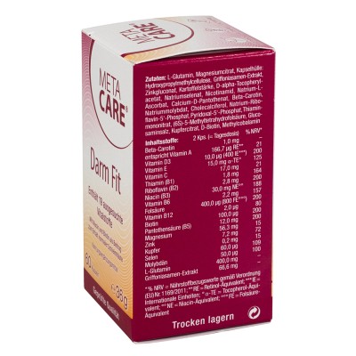META CARE® Darm Fit ergänzt unsere Ernährung sowie die körpereigene Synthese mit wichtigen Vitaminen, Mineralstoffen und Spurenelementen. Die Funktionsfähigkeit des Darms, der Schleimhäute und des Immunsystems können durch gesunde Ernährung ebenso unterstützt werden wie die Ansiedlung lebenswichtiger Darmbakterien.