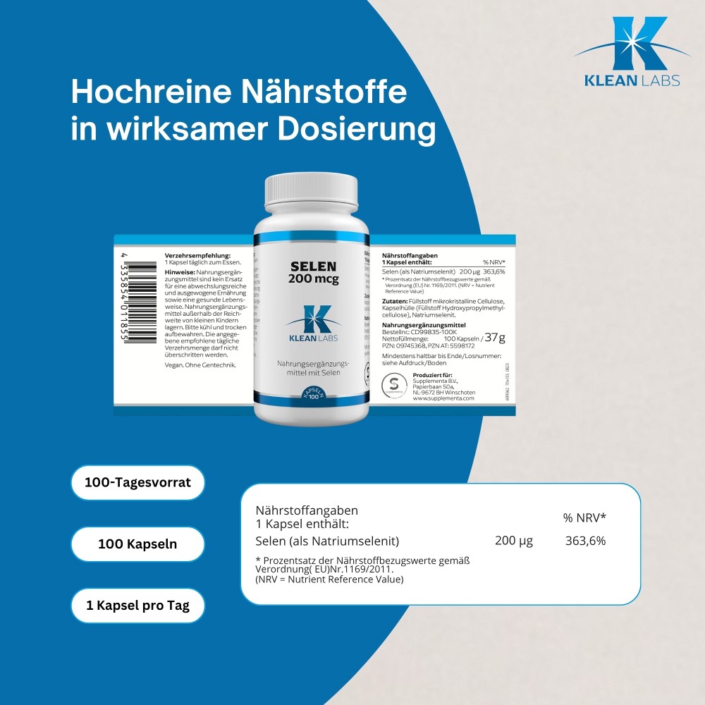 Selen 200 mcg von Klean Labs ist ein Nahrungsergänzungsmittel, welches 200 µg Selen pro Kapsel liefert.