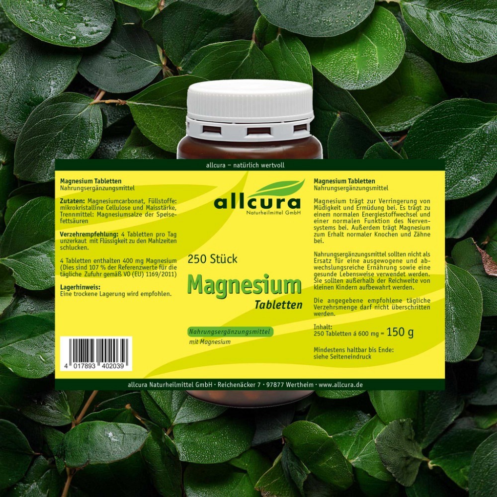 4 Tabletten enthalten 400 mg Magnesium und decken 107 % der Referenzmenge für die tägliche Zufuhr gemäß EU 1169 / 2011.