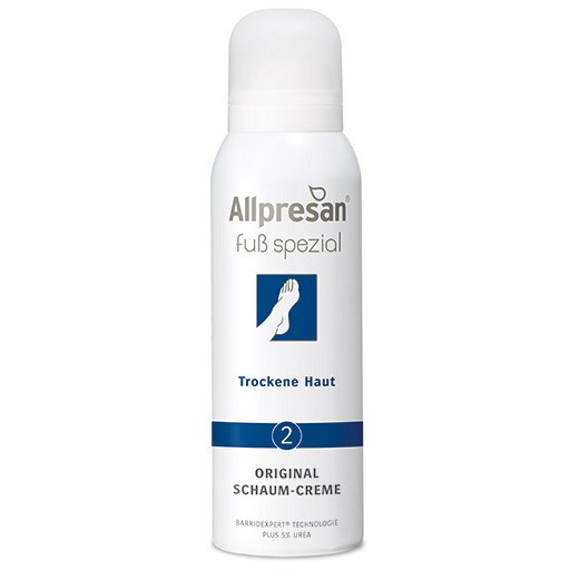 Die Allpresan® Fuß spezial 2 Original Schaum-Creme für trockene Fußhaut glättet die Haut und macht sie wieder geschmeidig. Zudem mindert sie Druckstellen und beugt ihrer Entstehung vor. Die natürliche Schutzfunktion der Haut wird unterstützt. Die Original Schaum-Creme enthält 5% Urea, das wasserbindende Eigenschaften besitzt, sowie Aloe Vera, dass kühlende, entzündungshemmende und ebenso feuchtigkeitsbewahrende Eigenschaften hat.