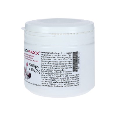 2 x täglich 1 Kapsel unzerkaut mit etwas Flüssigkeit verzehren.Die angegebene empfohlene tägliche Verzehrmenge darf nicht überschritten werden. Nahrungsergänzungsmittel sind kein Ersatz für eine ausgewogene und abwechslungsreiche Ernährung und eine gesunde Lebensweise. Schwangere, Stillende, Personen mit eingeschränkter Glucosetoleranz, sowie Verwendern von blutverdünnenden Arzneimitteln wird empfohlen, vor dem Verzehr von Arthromaxx® den Arzt zu befragen.