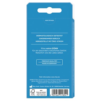 Medizinprodukt der Klasse II b/ Geprüft nach EN ISO 4074Ritex Kondome werden aus Rohstoffen bester Qualität ausschließlich in Deutschland hergestellt. Jedes Kondom wird einzeln elektronisch auf Dichtheit geprüft.