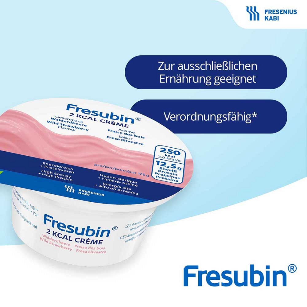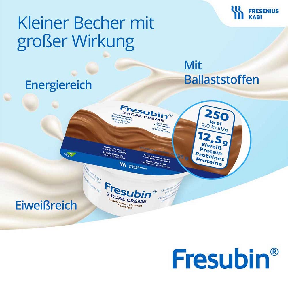 Als Alternative zur Trinknahrung sorgt die wohlschmeckende Fresubin® 2 kcal Creme für die ausreichende Versorgung des Körpers mit Energie und Eiweiß. Pro Becher enthält das Nahrungsmittel 250 kcal und 12,5 g Eiweiß, der Verzehr von 3 bis 4 Bechern deckt zudem den gesamten Tagesbedarf an Vitaminen und Mineralstoffen.Die Nährstoffe in der hochkalorischen Fresubin® 2 kcal Creme können durch ihre spezielle Aufbereitung vom Darm schnell aufgenommen werden, sind gut verträglich und leicht verdaulich. Die wohlschmeckende Creme mit puddingartiger Konsistenz eignet sich sowohl zur ergänzenden wie auch der ausschließlichen Ernährung bei drohender oder bestehender Mangelernährung mit einem erhöhten Energie- und Eiweißbedarf.