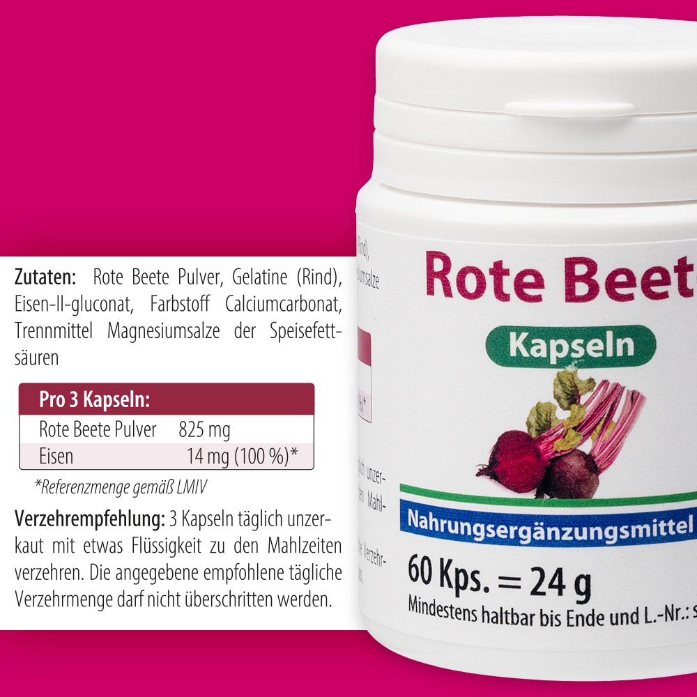 Nahrungsergänzungsmittel mit Rote Beete (Beta vulgaris) und dem Mineralstoff Eisen.Eisen trägt zur normalen Bildung von roten Blutkörperchen, Hämoglobin und zur Verringerung von Müdigkeit und Ermüdung bei. Es ist für die Zellbildung, vor allem aber für die "Zellatmung" wichtig. Das bedeutet: Der Sauerstoff, den wir über die Lunge aufnehmen, wird mit seiner Hilfe an den roten Blutfarbstoff Hämoglobin gebunden, über das Blut im ganzen Körper verteilt und in den Zellen für die Energiegewinnung genutzt.