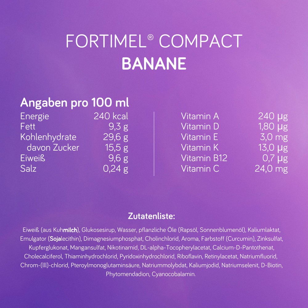 - Die Fortimel Compact 2.4 kcal Trinkmahlzeit mit Bananengeschmack bietet eine optimale Möglichkeit, alle wichtigen Nährstoffe zu erhalten