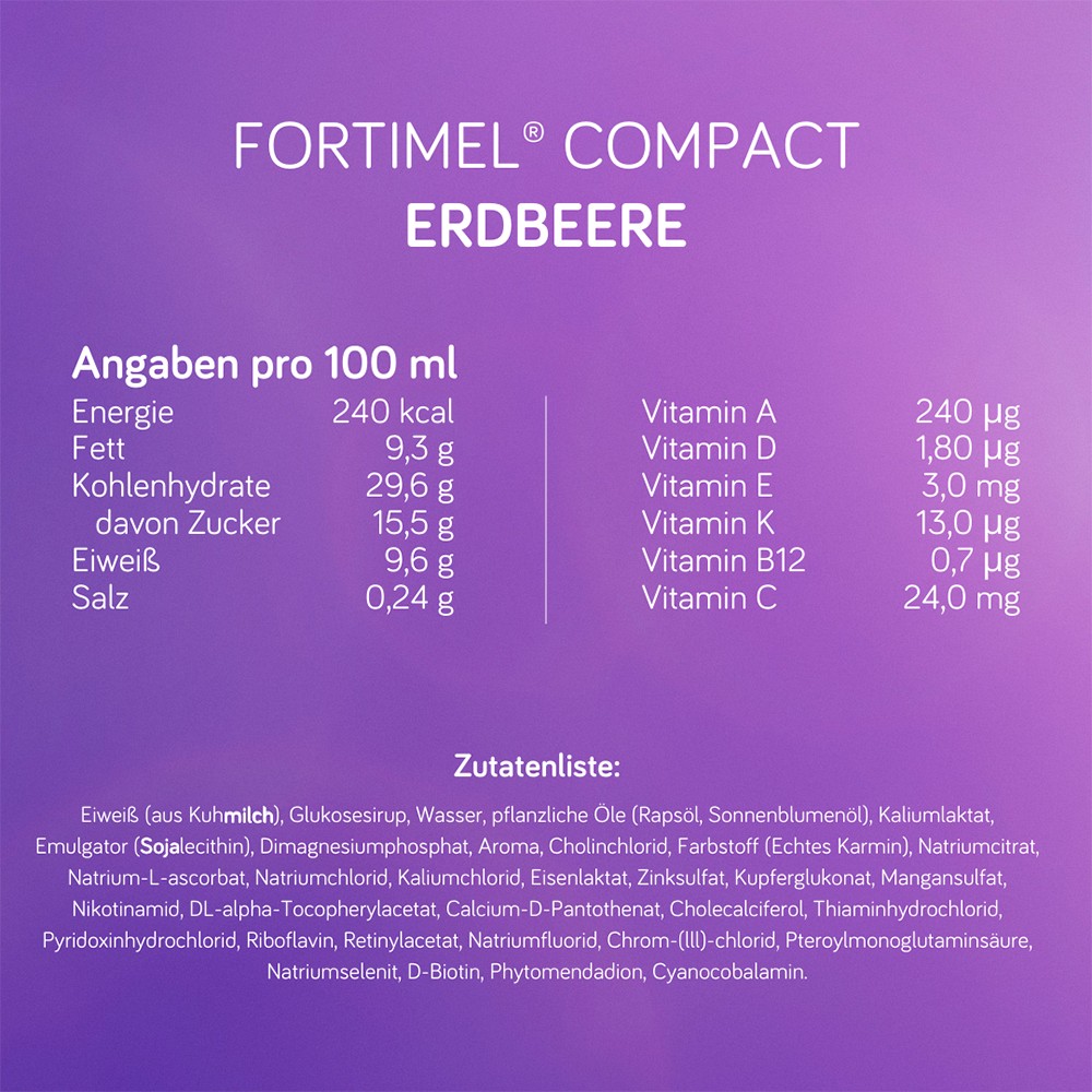 - Die Fortimel Compact 2.4 kcal Trinkmahlzeit mit Erdbeergeschmack bietet eine optimale Möglichkeit, alle wichtigen Nährstoffe zu erhalten