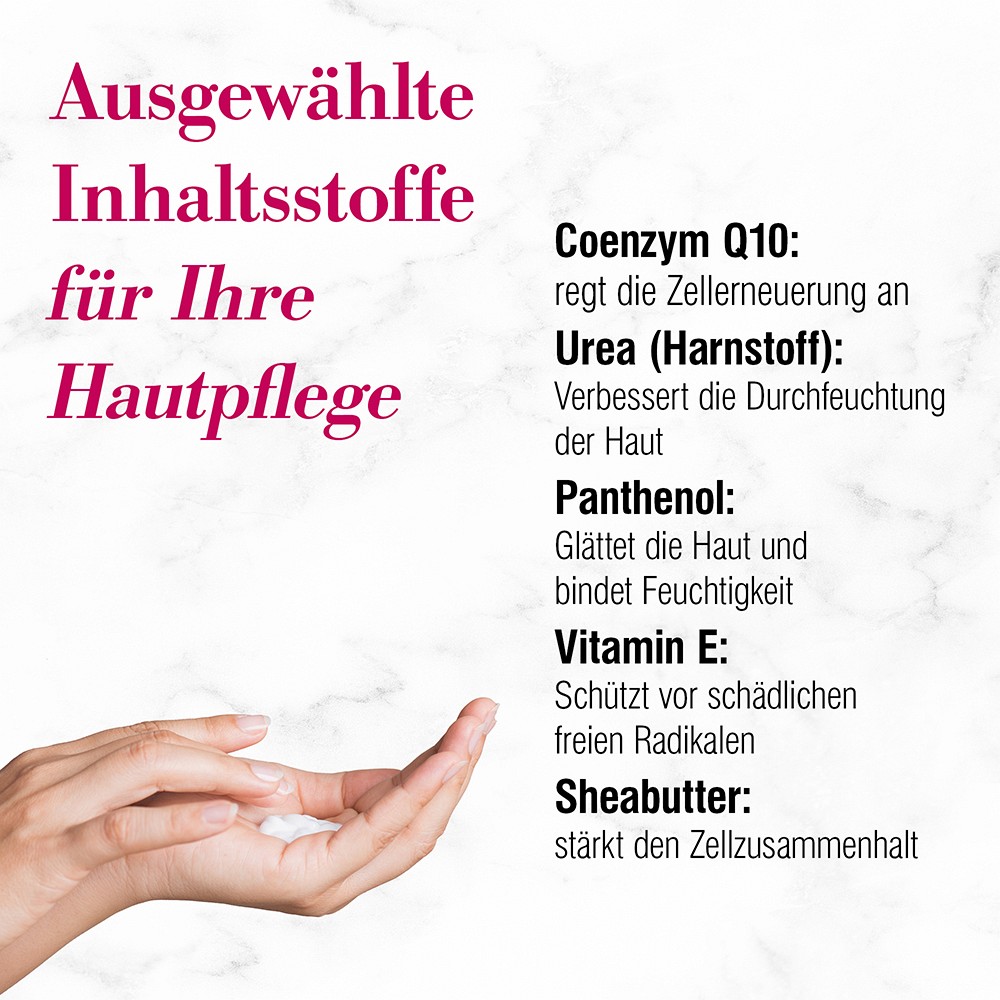 Gleichmäßig auf die gereinigte Haut auftragen und sanft einmassieren. Der hygienische Pumpspender sorgt für eine unkomplizierte und sparsame Anwendung.*Die Aussagen zur Hautverträglichkeit, Feuchtigkeitsversorgung, Elastizität und Glätte basieren auf Studien der Derma Consult Concept GmbH, Bonn, 2014
