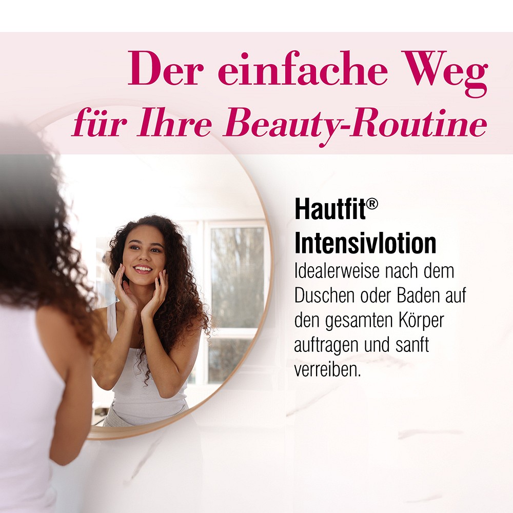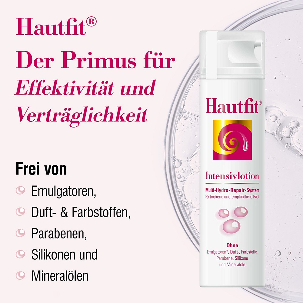 Wenn die Haut an Körper und Beinen spannt, trocken und rau ist, sind dies Anzeichen von Feuchtigkeitsmangel. Die Ursache ist eine nicht intakte Schutzbarriere der Haut, so dass zu viel Feuchtigkeit entweichen kann.Die Hautfit Intensivlotion zeigt genau da mit einem Wirkstoffbooster für intensive Feuchtigkeit Regeneration und Schutz ihre Wirkung. Die reichhaltige Intensivlotion lässt sich leicht verteilen, zieht schnell ein, fettet nicht, hinterlässt ein angenehm gepflegtes Hautgefühl und ist sparsam im Verbrauch.
