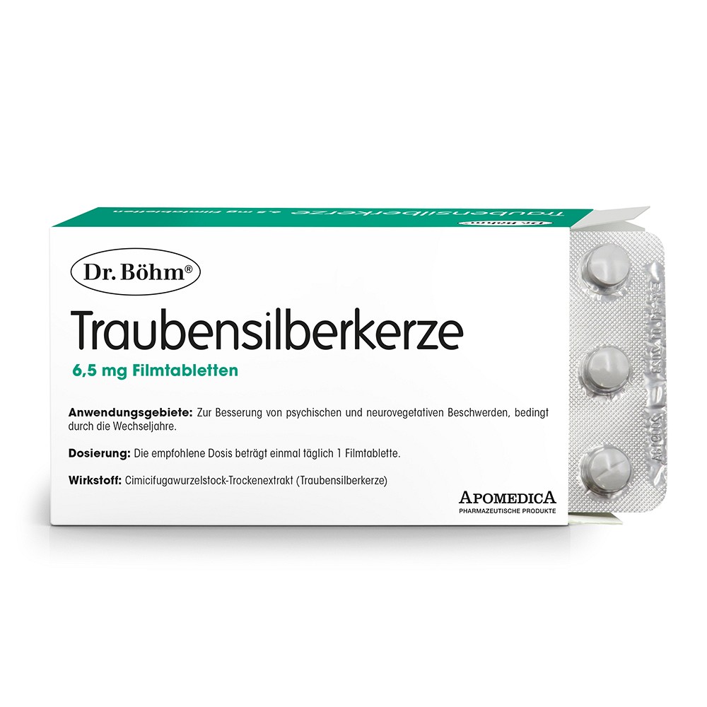 Dr. Böhm® Traubensilberkerze ist ein pflanzliches Arzneimittel zur Besserung von psychischen und neurovegetativen Beschwerden, bedingt durch die Wechseljahre.Einnahmeempfehlung: