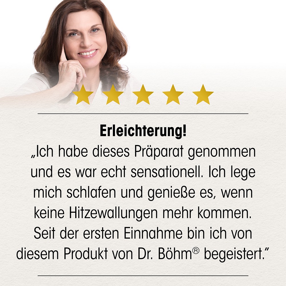 Wechseljahre im Gleichgewicht dank der ausgleichenden Wirkung von Dr. Böhm® Traubensilberkerze. Die hochwertigen, rein pflanzlichen Filmtabletten sind die ideale Unterstützung gegen Hitzewallungen, Schweißausbrüche, Verstimmungen und Reizbarkeit –. und das ganz hormonfrei.Cool bleiben, wenn die Hormone einheizen